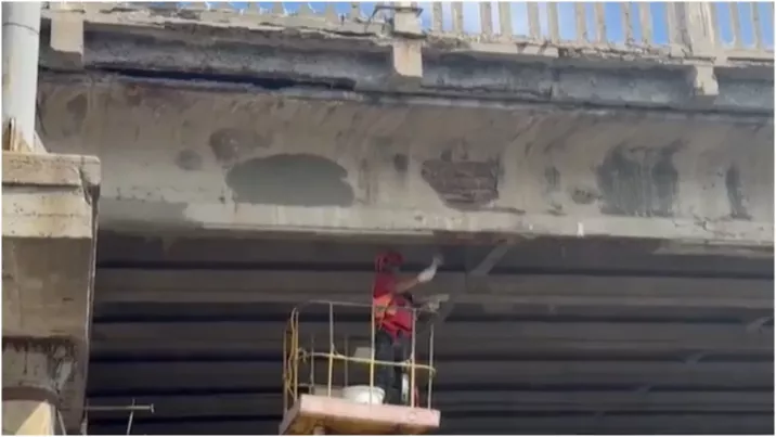 На следующий день после инцидента на мосту появились рабочие, которые начали латать трещины.