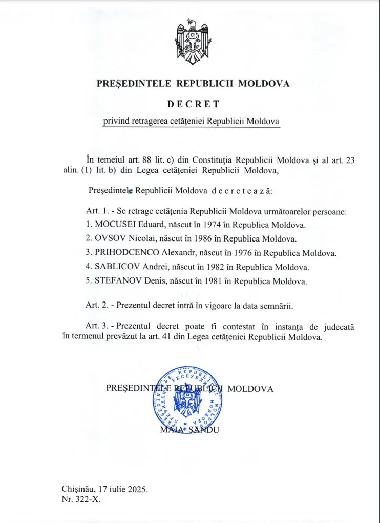 Президент Молдовы Майя Санду 17 июля подписала указ о лишении гражданства пяти человек. Их личности не раскрывались, но стали известны после публикации указа. Решение принято на основании положений закона о гражданстве, касающихся добровольной службы в иностранных вооруженных силах.