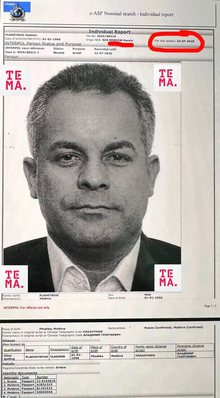 Сегодня Telegram-канал TEMA, к которому имеет отношение молдавский журналист Владимир Соловьёв, ранее работавший в российском "Коммерсанте", сообщил, что 23 июля правоохранительные органы РФ объявили Плахотнюка в розыск по линии Интерпола “закрытым ордером”. Это, по мнению авторов канала, свидетельствует о намерении Москвы добиваться от греческих властей экстрадиции олигарха.