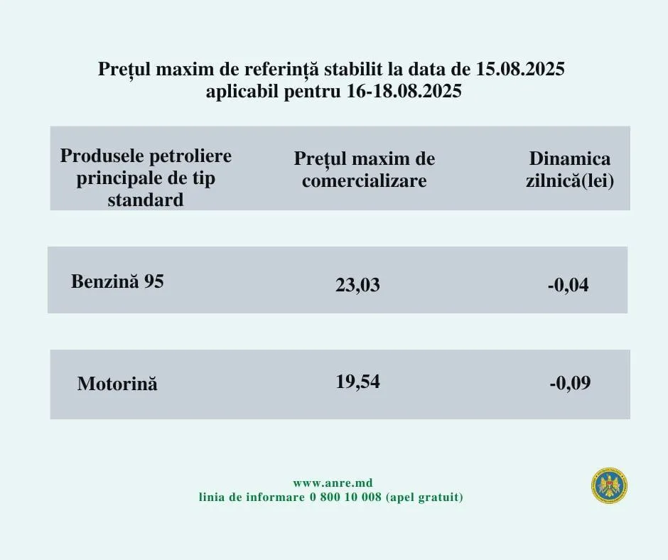 Национальное агентство по регулированию в энергетике (НАРЭ) снизило максимальную стоимость основных видов горючего. Так, предельная цена бензина составила 23 лея и 3 бана, а дизтоплива - 19 леев и 54 бана.