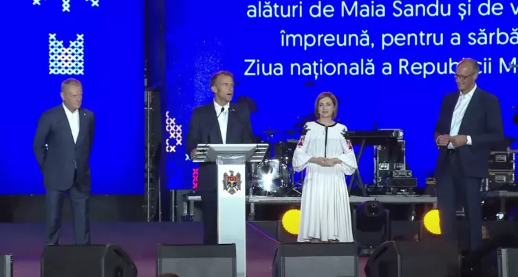 Лидер Франции Эммануэль Макрон зачитал фрагмент текста на румынском языке, где подчеркнул, что Республика Молдова имеет основания гордиться пройденным путём за 34 года независимости и может верить в своё европейское будущее.