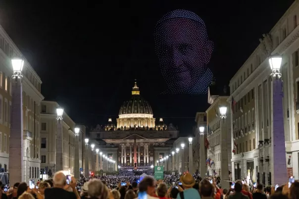 Тысячи людей собрались на площади Святого Петра в Риме, чтобы увидеть световое шоу и послушать концерт Grace for the World.