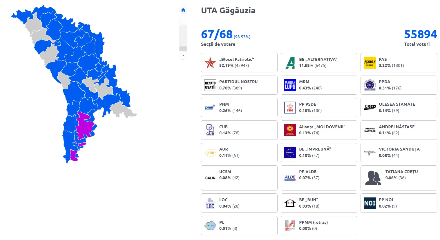В Гагаузии снова, как и в прошлые электоральные циклы, поддержка Партии социалистов, как и нынешнего блока, в который она входит, оказалась подавляющей. В автономии "Патриотический блок" взял 82,19% голосов. Блок "Альтернатива" на втором месте с 11,58%, а PAS смог набрать всего 3,22%. Явка в Гагаузии составила 58 323 человека.