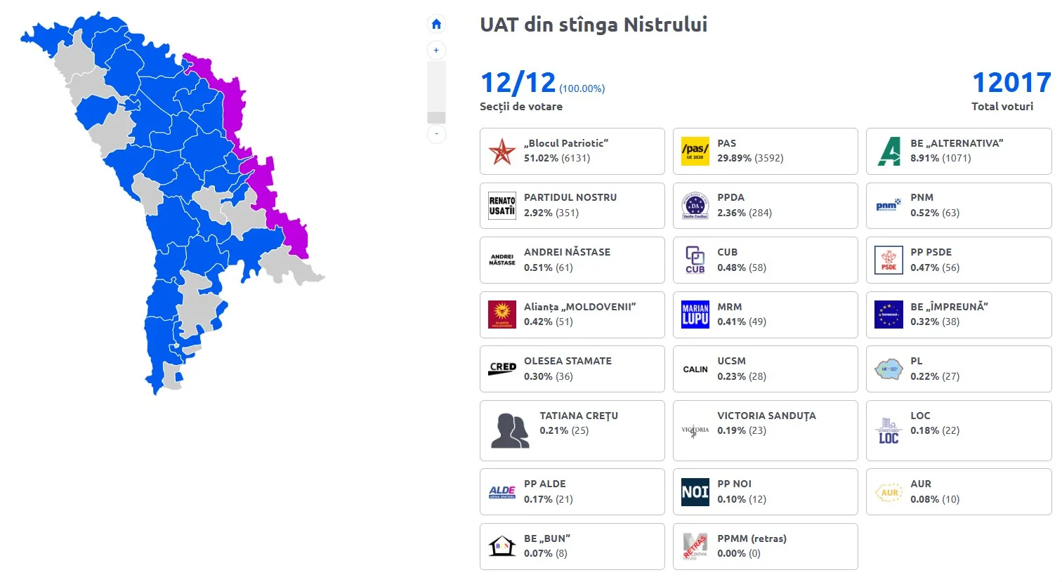 В Приднестровском регионе на выборы, как и в прошлые электоральные циклы, пришел относительно небольшой процент избирателей 12 266 человек. После обработки всех протоколов лидирующую позицию занял "Патриотический блок" с 51,02% голосов. Однако PAS смогла получить 29,89%. Замыкает тройку блок "Альтернатива" с 8,91%.