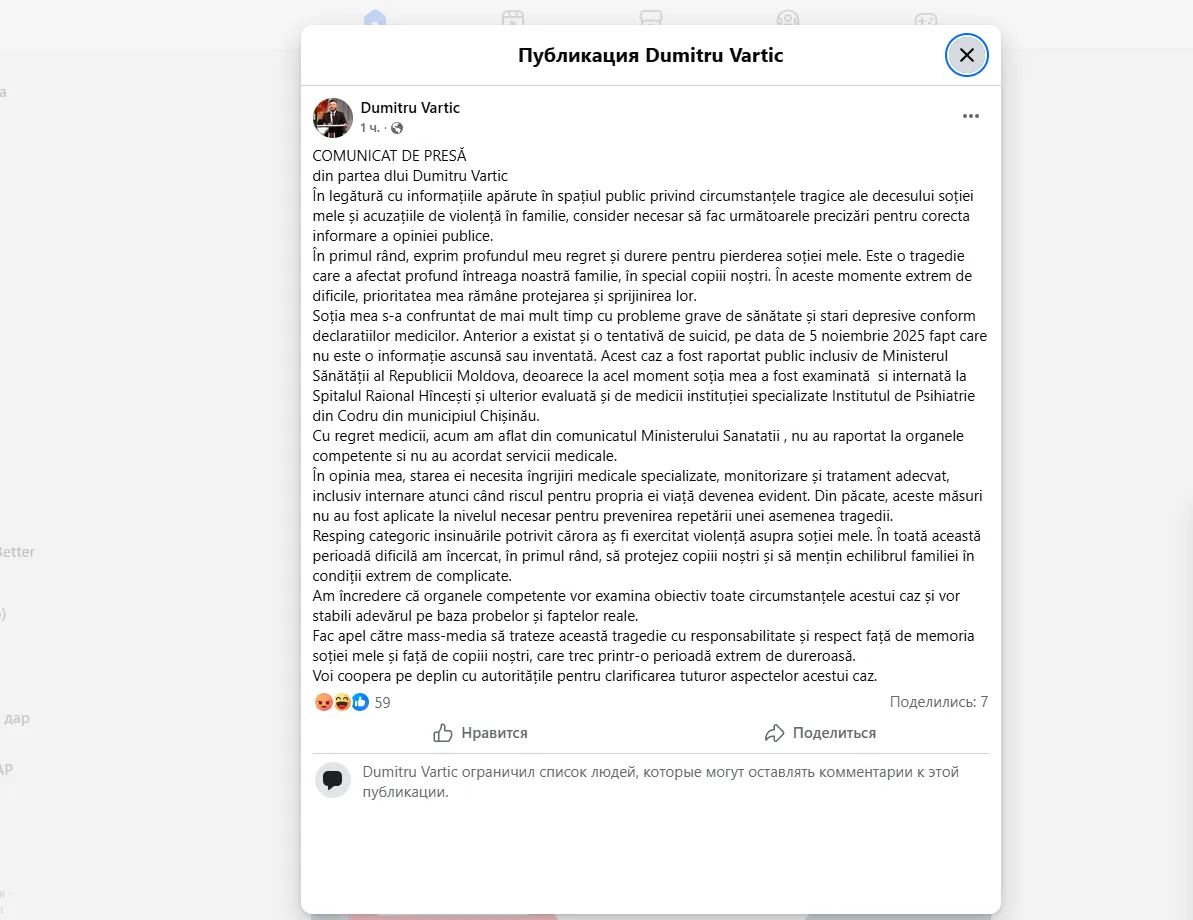 Он заявил, что 5 ноября 2025 года его супруга уже предпринимала попытку покончить с собой. По его словам, женщина длительное время страдала от серьёзных проблем со здоровьем и депрессивных состояний, о чём говорили врачи. Однако эту информацию не передали правоохранительным органам после осмотра супруги специалистами Института психиатрии в Кодру, утверждает Вартик.
