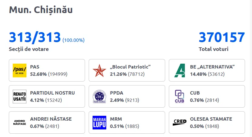 По итогам выборов в законодательный орган проходят пять формирований. Блок "Альтернатива" получил 7,96% голосов и 8 депутатских мандатов.