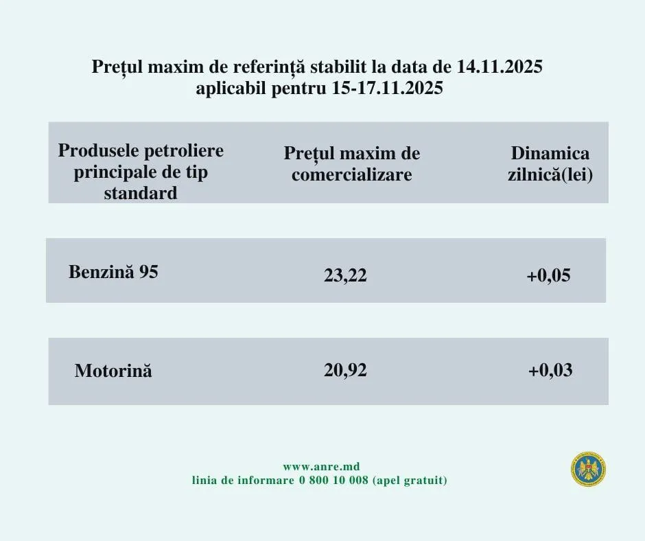 На выходных и в понедельник максимальная цена на бензин АИ-95 составит 23,22 леев (+5 банов), а на солярку — до 20,92 леев (+3 бана).