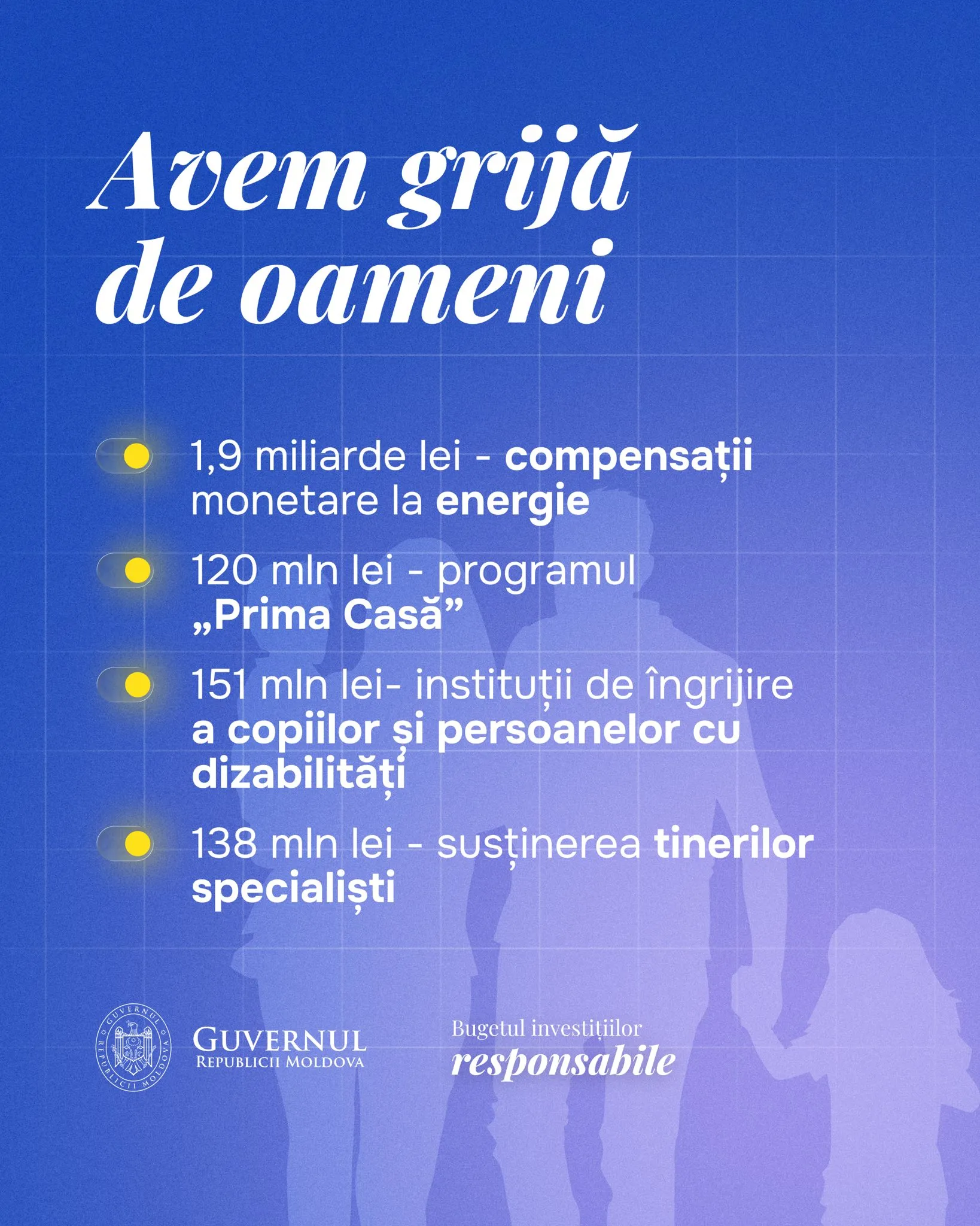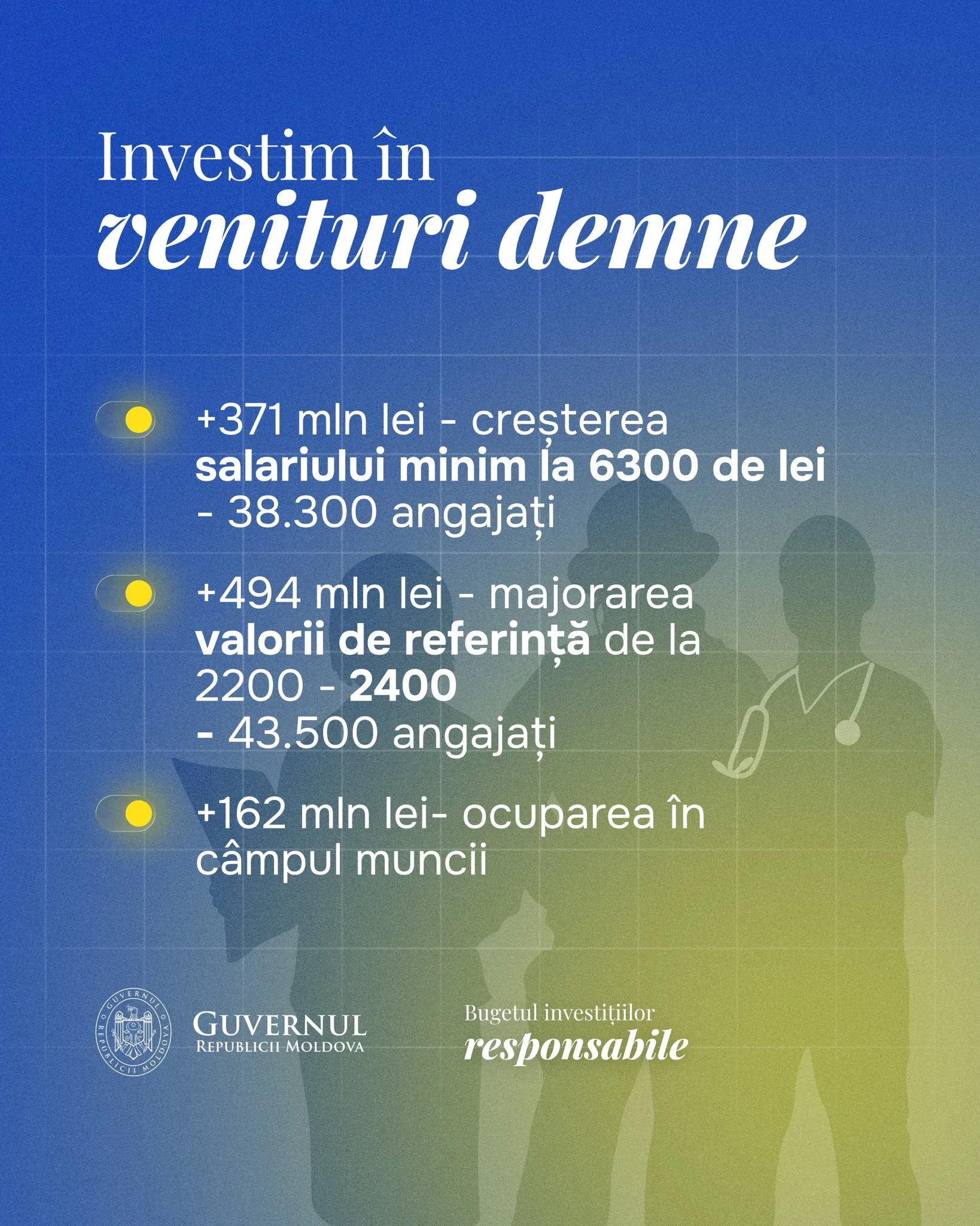 Запланирован пересмотр зарплат. С 2026 года минимальная зарплата вырастет до 6 300 леев, рост базовой расчётной величины при начислении зарплат увеличится с 2200 до 2400 леев. Также предусмотрена новая система оплаты труда — она должна устранить существующий дисбаланс и улучшить условия для уязвимых категорий работников.