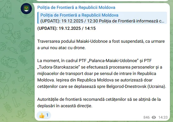 Уточним, вчера, 18 декабря во время очередной атаки России на Украину дрон ударил по мосту вблизи села Маяки. В связи с этим временно закрыли два пункта пропуска на молдавско-украинской границе.