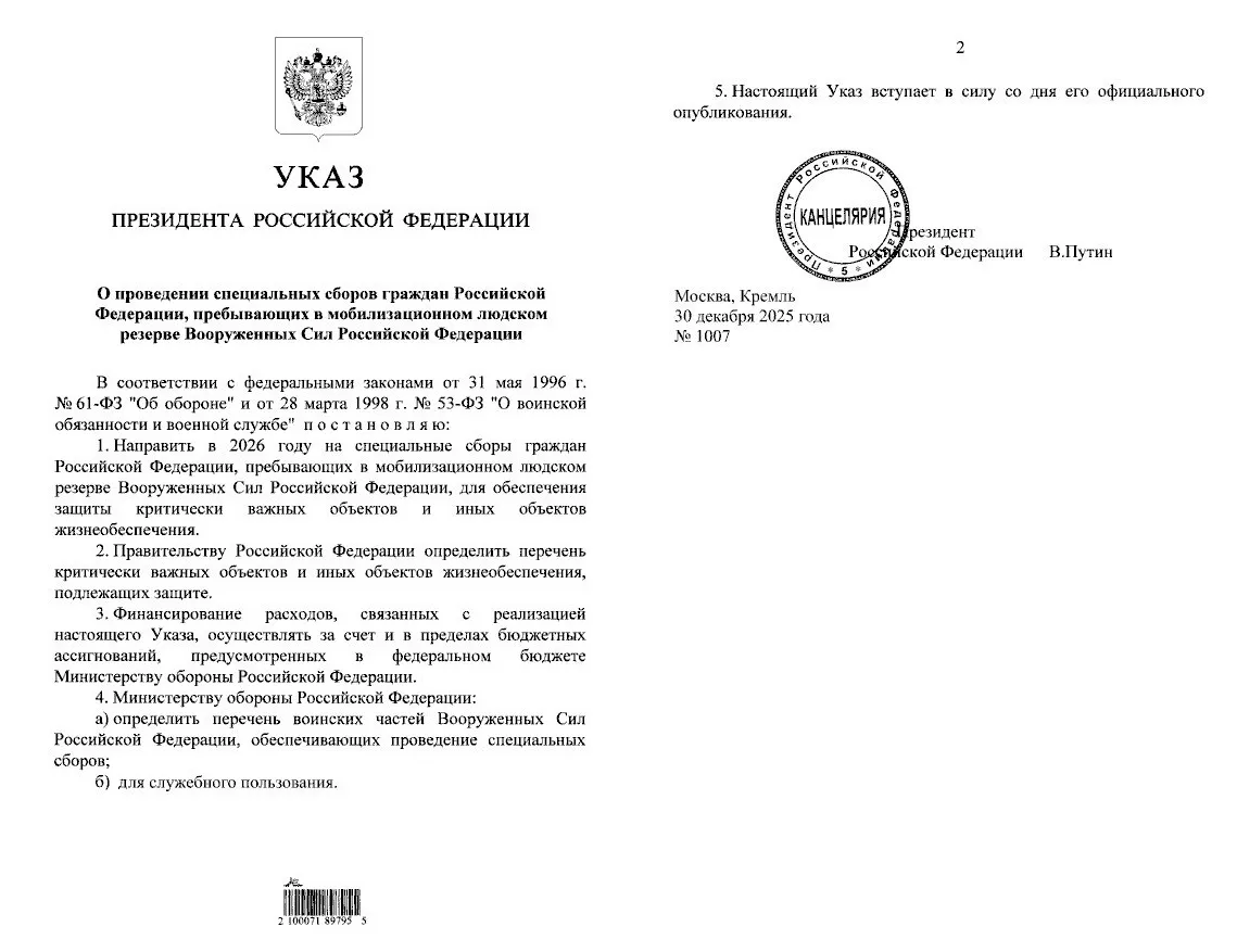 В 2026 году граждан из мобилизационного резерва Вооруженных сил России привлекут к "обеспечению защиты критически важных объектов и иных объектов жизнеобеспечения". Правительству поручено определить перечень таких объектов, а Министерству обороны — перечень воинских частей, обеспечивающих проведение специальных сборов.