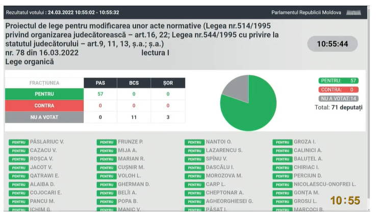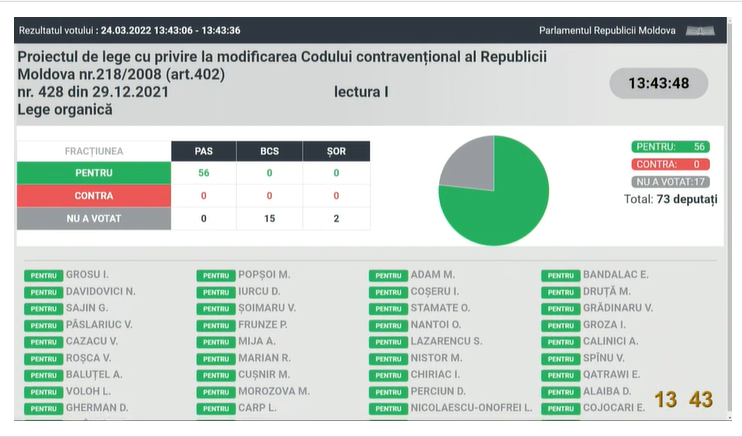 UPDATE 13:43 Cu votul a 56 de eputați a fost aprobat în prima lectură proiectul de lege cu privire la modificarea Codului Contravențional al Republicii Moldova.