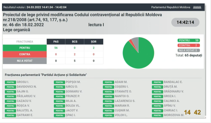 UPDATE 11:30 Cu votul a 56 de deputați a fost aprobat în prima lectură proiectul de lege privind modificarea Codului contravențional al Republicii Moldova.