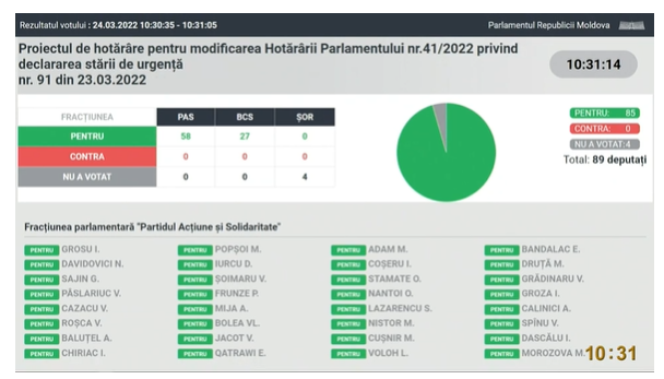 UPDATE 10:31 A fost aprobat proiectul de hotărâre pentru modificarea Hotărârii Parlamentului privind delararea stării de urgență.