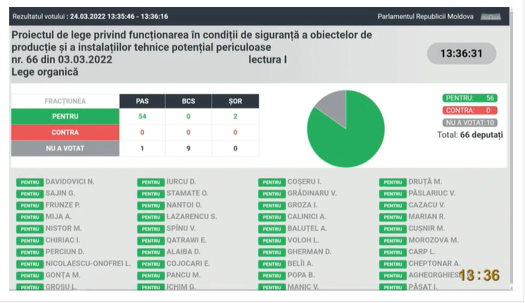 UPDATE 13: 36 A fost aprobat proiectul de lege privind funcționarea în condiții de siguranță a obiectelor de producție și a instalațiilor tehnice potențial periculoase.