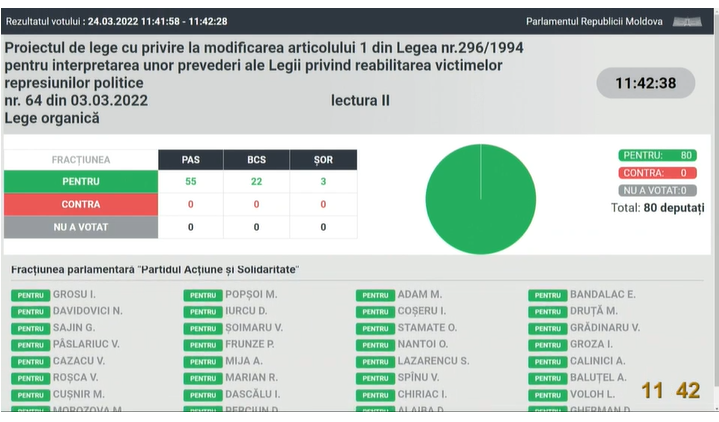 UPDATE 11:42 În cadrul ședinței plenare de joi au fost votate atât în prima lectură, cât și în lectura a doua proiectul de lege cu privire la interpretarea unor prevederi ale Legii privind reabilitarea victimelor represiunilor politice.