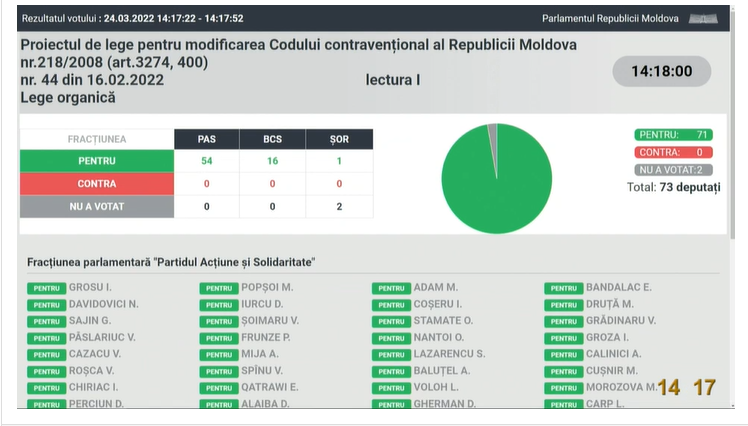 UPDATE 14:18 A fost votat proiectul de lege pentru modificarea Codului Contravențional al R. Moldova nr 218/2008.