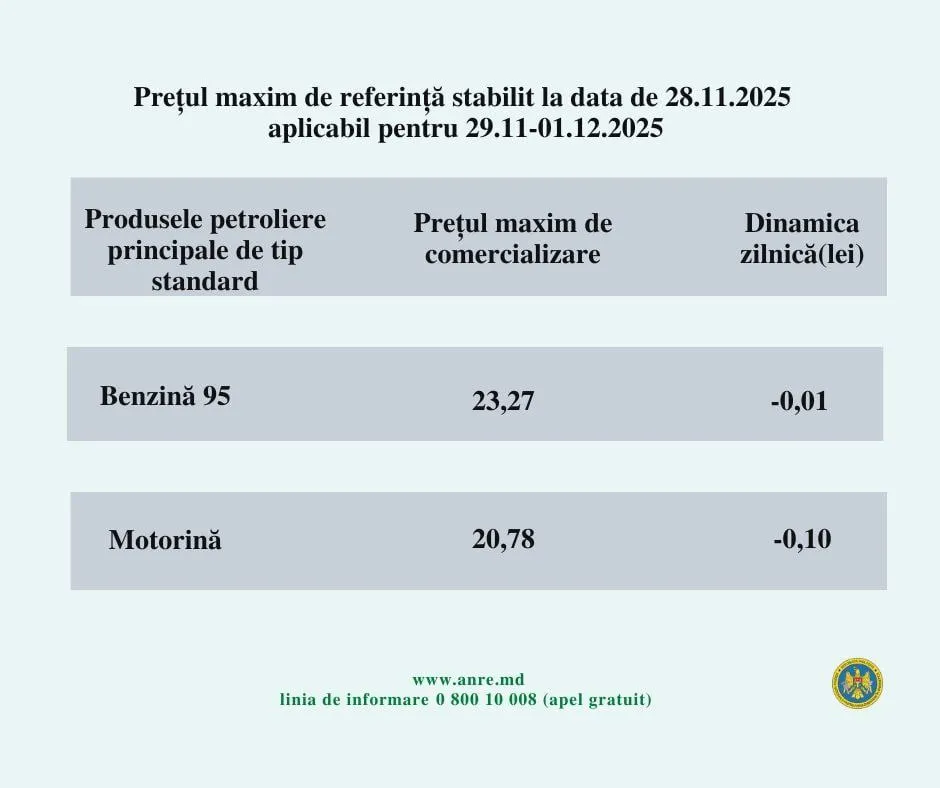 Prețurile carburanților continuă să scadă. Agenția Națională pentru Reglementare în Energetică (ANRE) anunță noile prețuri pentru zilele de 29, 30 noiembrie și 1 decembrie 2025. Astfel, benzina se va ieftini cu 1 ban, iar motorina cu 10 bani.