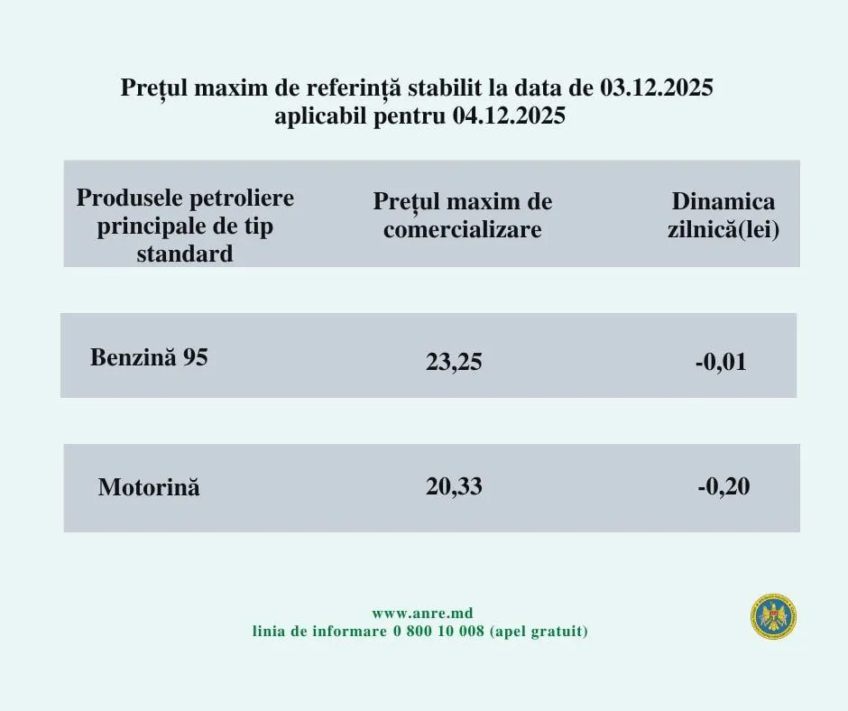 Prețul carburanților continuă să scadă. Agenția Națională pentru Reglementare în Energetică (ANRE) anunță noile prețuri pentru ziua de joi, 4 decembrie 2025. Astfel, benzina se va ieftini cu 1 ban, iar motorina cu 20 de bani.