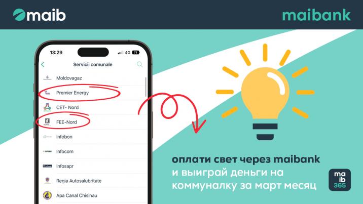 Maib организует с 15 марта по 15 апреля 2023 года акцию «Оплати свет через app maibank - выиграй деньги на всю коммуналку за март».
