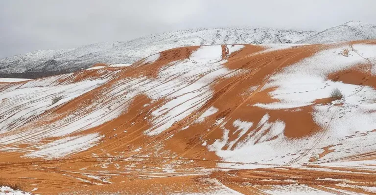 В алжирском городе Айн-Сефра прежде жаркая температура воздуха опустилась ниже нуля, создав идеальные условия для снегопада. Песчаные дюны пустыни Сахары покрылись тонким слоем снега. Несмотря на восторг местных жителей и туристов, снежный покров оказался недолговечным и начал быстро таять, сообщает Daily Mail.